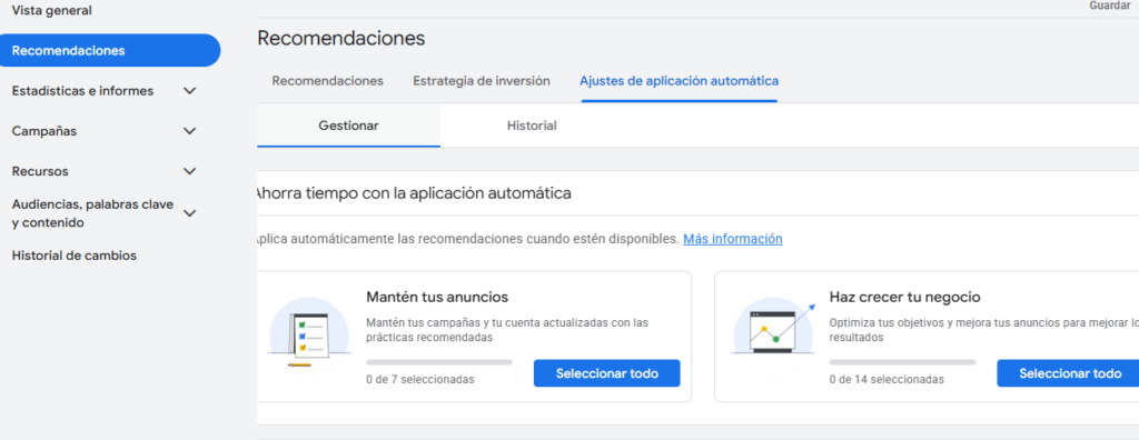 Google permite activar una función para que estas sugerencias se apliquen solas, sin que tú intervengas. Sin embargo, como hemos analizado, no todas estas recomendaciones te servirán. De hecho, muchas de ellas podrían arruinar el rendimeinto de la campaña.