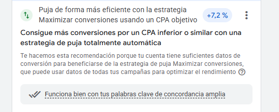Otra recomendación común, es la que sugiere pasar de pujas manuales (como CPC Manual o maximimar clics) a una oferta Smart Bidding, como Roas o CPA Objetivo.