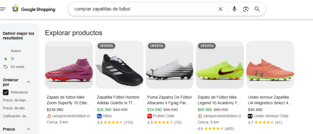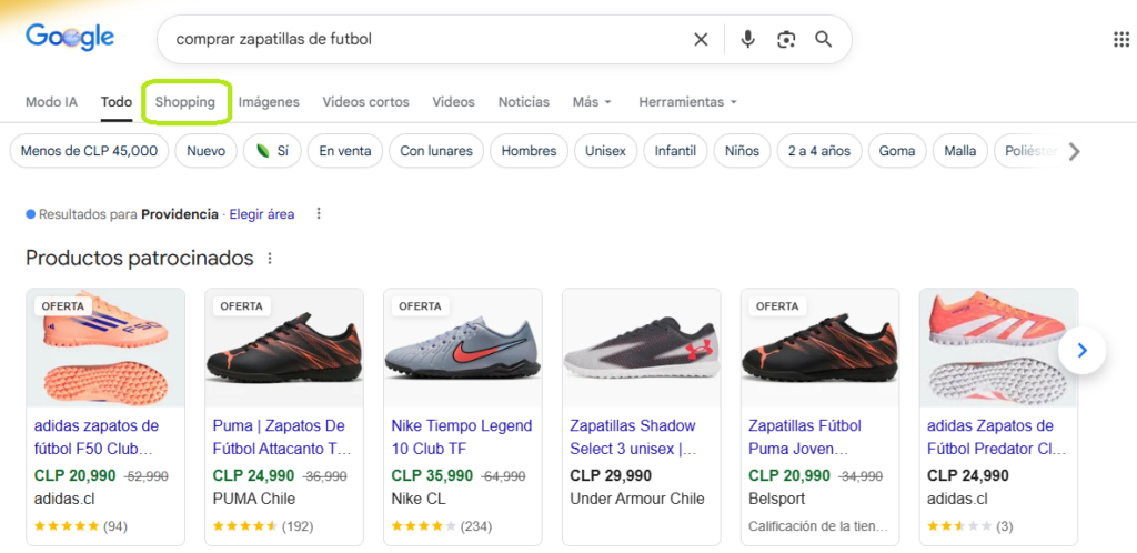 Como puedes ver en la imagen de arriba, al entrar en Google y escribir lo que estás buscando aparecen varios resultados. Los únicos con fotografías corresponden a los anuncios de pago de Google Ads Shopping («Productos patrocinados»).