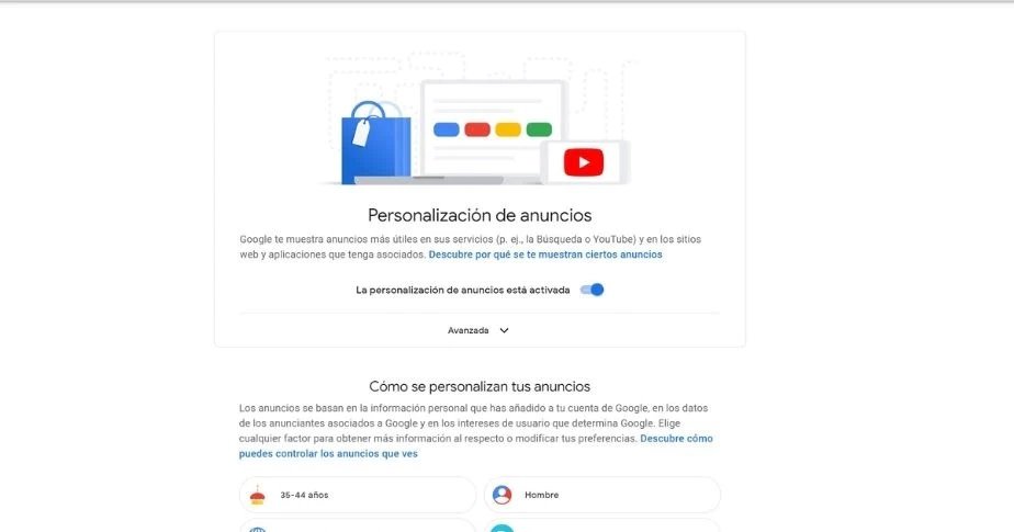3. Lo primero que verás es si la funcionalidad de anuncios personalizados está activada o no. Ahí hay un botón para desactivarla o activarla a tu gusto.