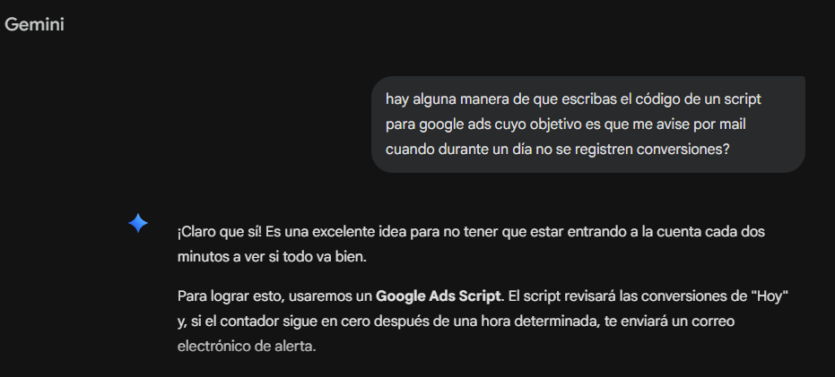 La idea era que me notificara vía mail y una vez al día, en el caso de que una cuenta no generara conversiones. Y el primer prompt fue MUY simple:
